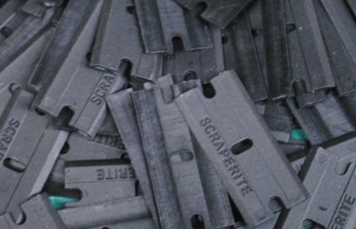 A pack of 100 double edged blades for the Lil Gripper vinyl remover in black industrial plastic for heavy duty use.