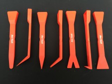 6pc trim and pry set to help you remove interior and exterior trim without damaging paintwork or surfaces. 3 softer red tools and 3 harder black tools.